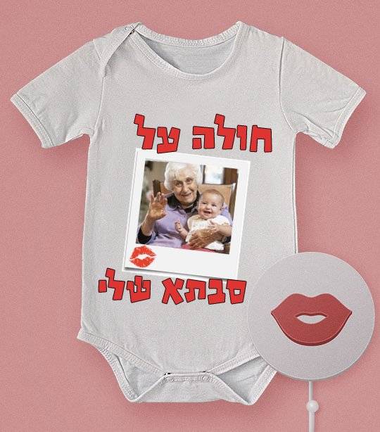 אוברול תינוקת עם הדפס "חולה על סבתא שלי" בגד תינוקת 100 אחוז כותנה. עם הדפסה של הקדשה לסבתא ותמונה של התינוקת עם סבתא היקרה