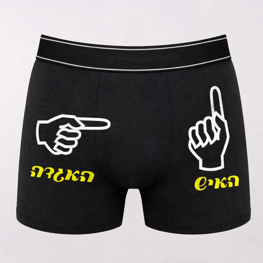 בוקסר שחור מצחיק במיוחד עם איורים של יד מצביעה ויד מנצחת, שמבהירים בדיוק מי פה האגדה ומי האיש.