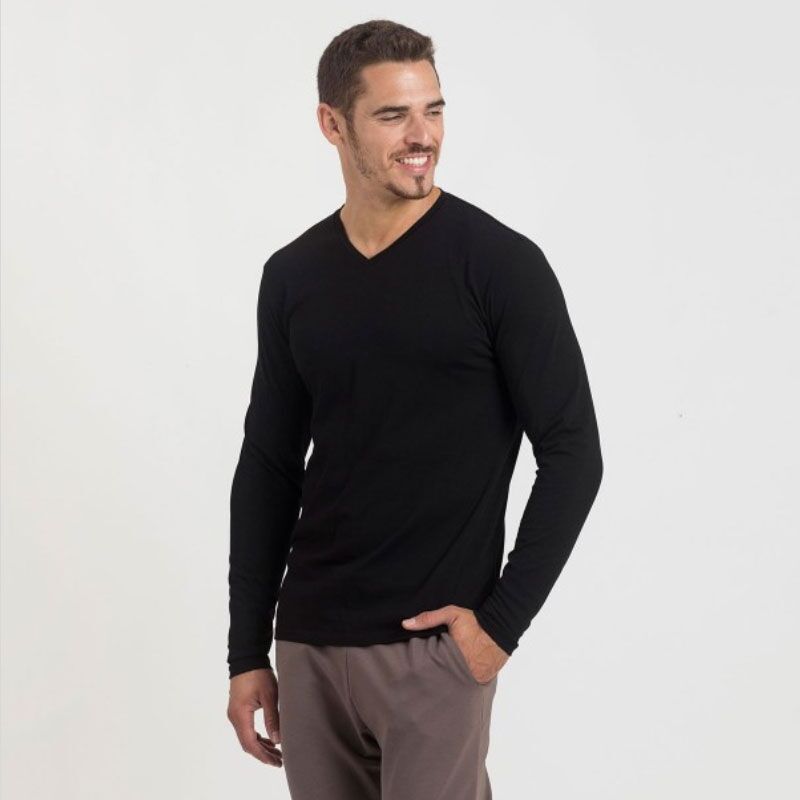 חולצת כותנה בצבע שחור לגברים צווארון וי שרוול ארוך [ מותג – Hanes ]