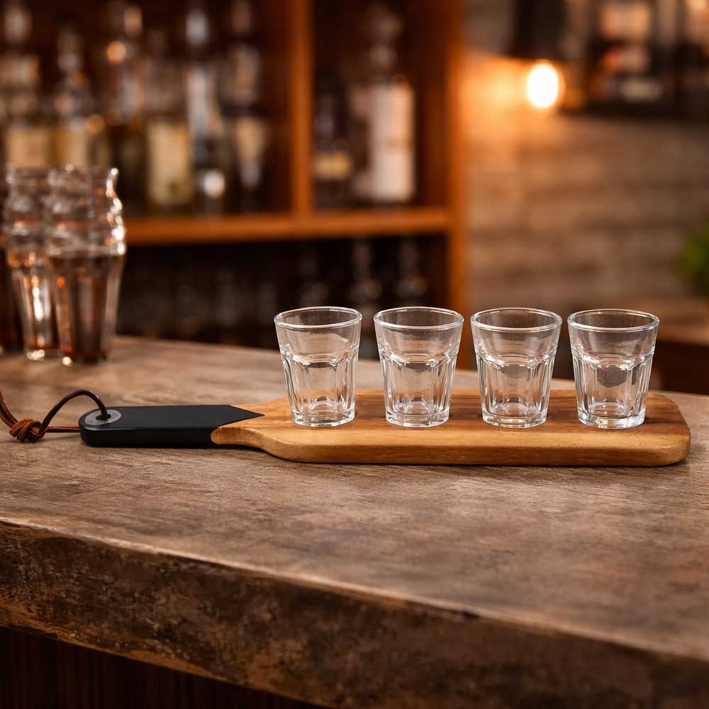 משטח עץ יוקרתי עם 4 צ'ייסרים – בהתאמה אישית