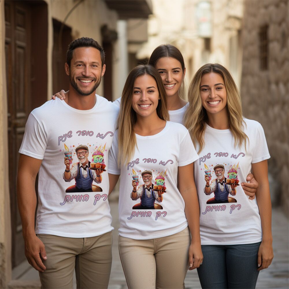 - חולצות לאירועים משפחתיים, חולצות מגניבות, חולצות מצחיקות, חולצות משפחתיות, חולצות סוף מסלול למשפחה, מתנה לגיל 40, מתנה לגיל 50, מתנה לגיל 60, מתנה לגיל 70, מתנה לגיל 80, מתנות, מתנת יום הולדת, הדפסת חולצות באיכות גבוהה ומחיר אטרקטיבי, חולצות לאבא וסבא
