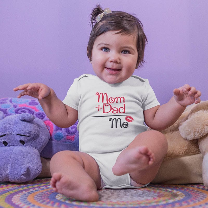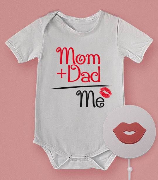 הדפסה על בגד תינוק חמוד עם כיתוב לאמא ואבא ביחד. הדפסה באדום ושחור בגד תינוק בצבע לבן מכותנה איכותית 100 אחוז