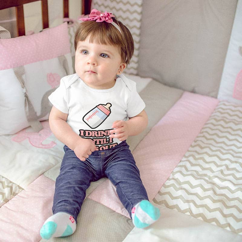 הדפסה על אוברול לתינוק "Pass Out" אני שותה עד שאני מתעלפת" בגד תינוק מצחיק  וחמוד לתינוקת שלכם. הדפסה בורוד ושחור בגד תינוק בצבע לבן מכותנה איכותית 100 אחוז