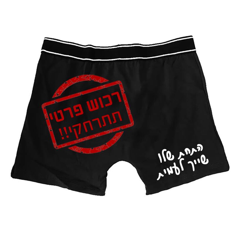 תצהירי שהתחת שלו שלך, Let the world know, בוקסר איכותי מכותנה ולייקרה משולב עם הדפסה של כיתוב וחותמת "התחת שלו זה רכוש פרטי שלך!"