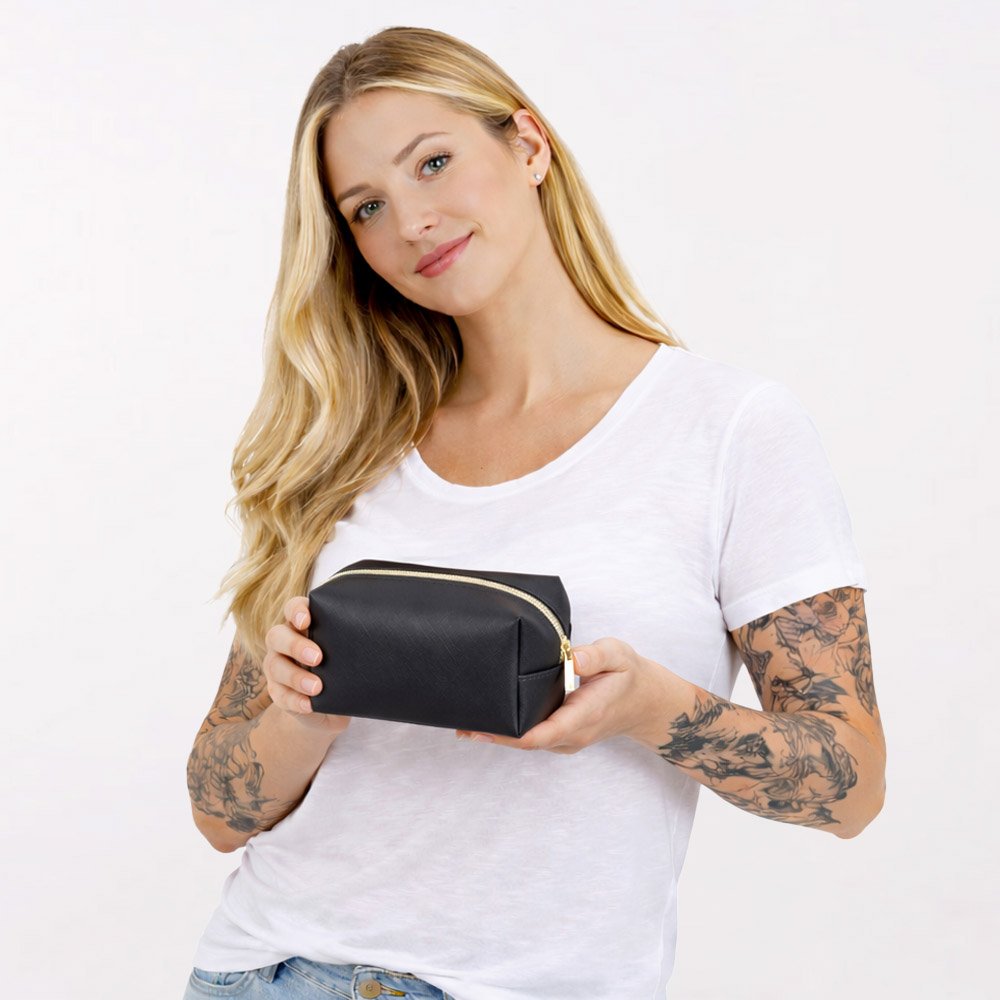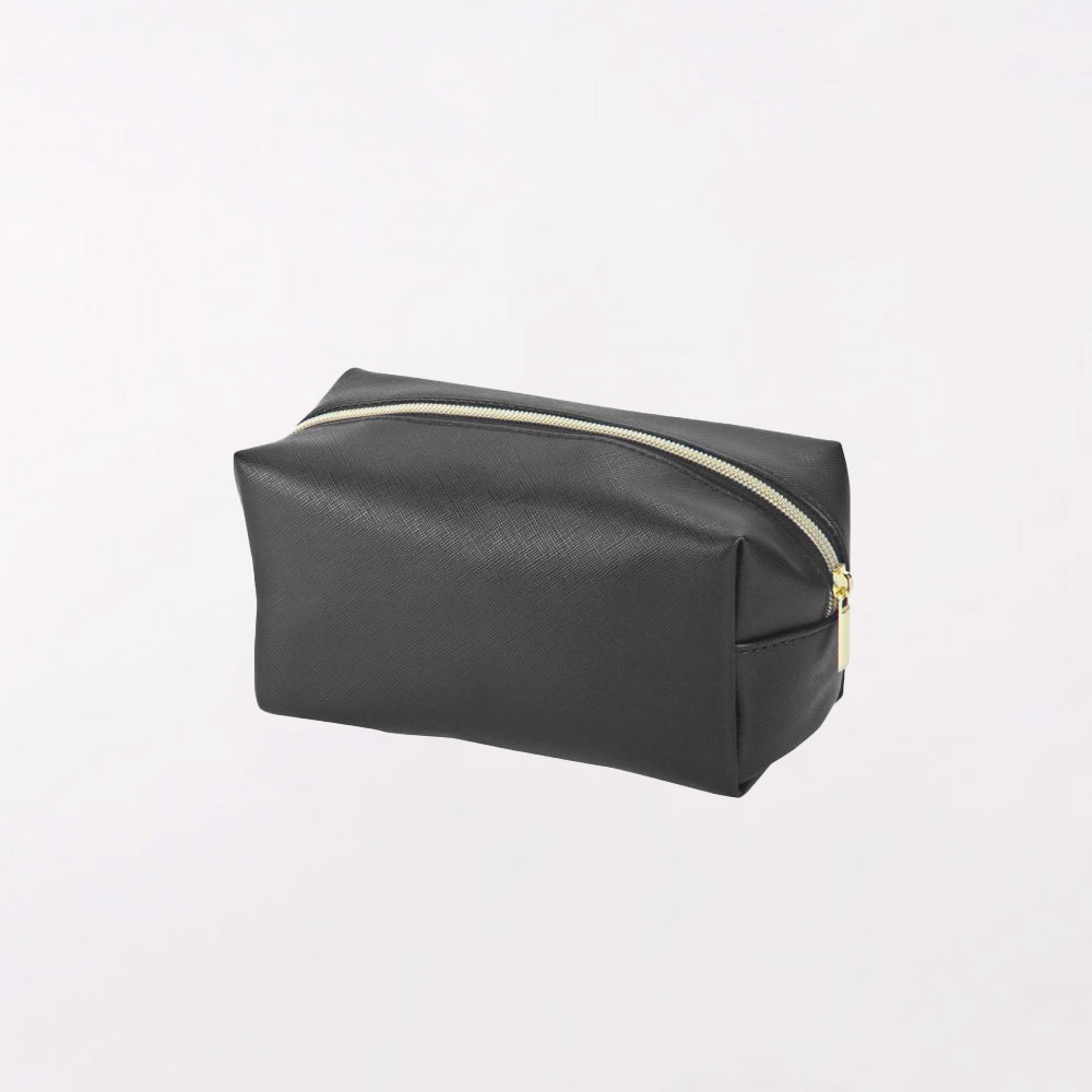 הדפסה על תיק איפור שחור עם רוכסן צבע זהב.