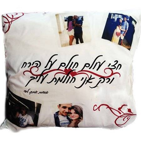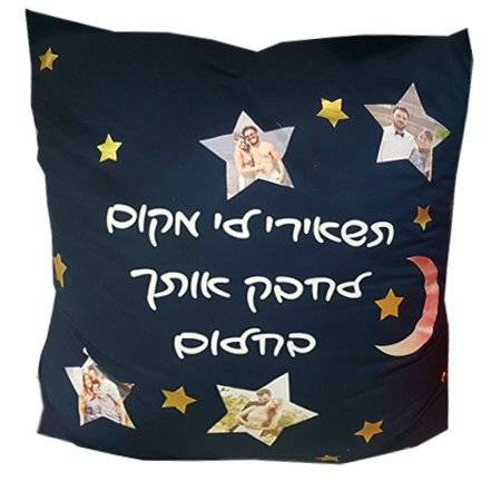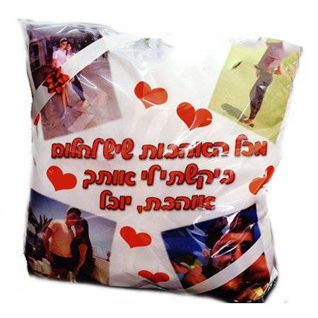 כרית ענקית בגודל 80 על 80 ס"מ עם עד 6 תמונות והקדשה במרכז ועיטורים יפים מסביב, מומלץ לכל מי שאוהב לראות טלוויזיה ומחפש משהו ענק להישען עליו!