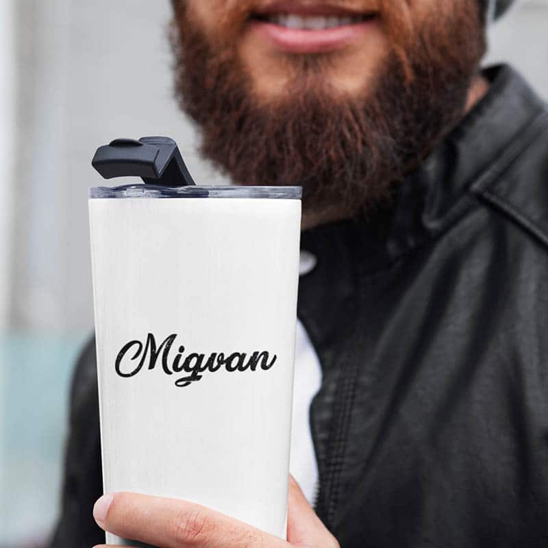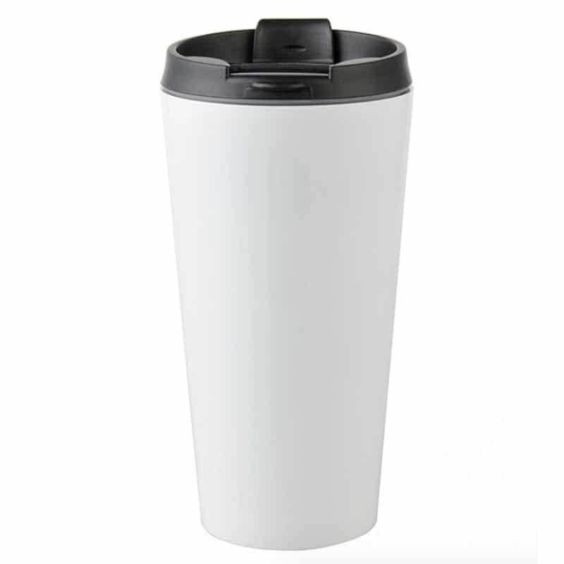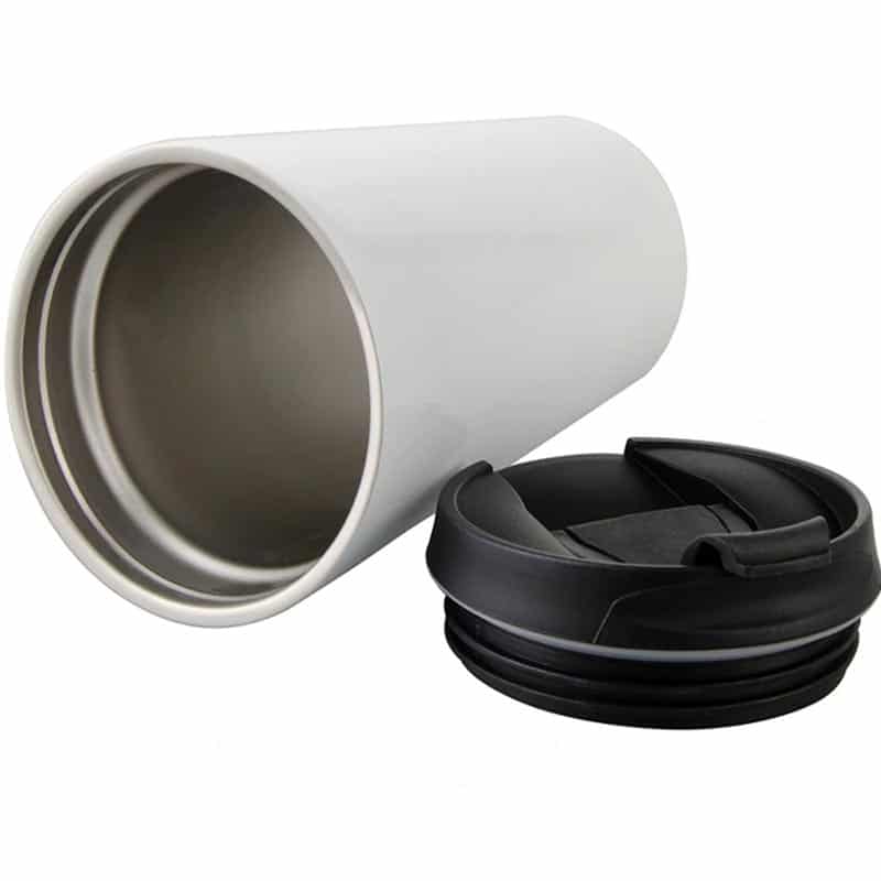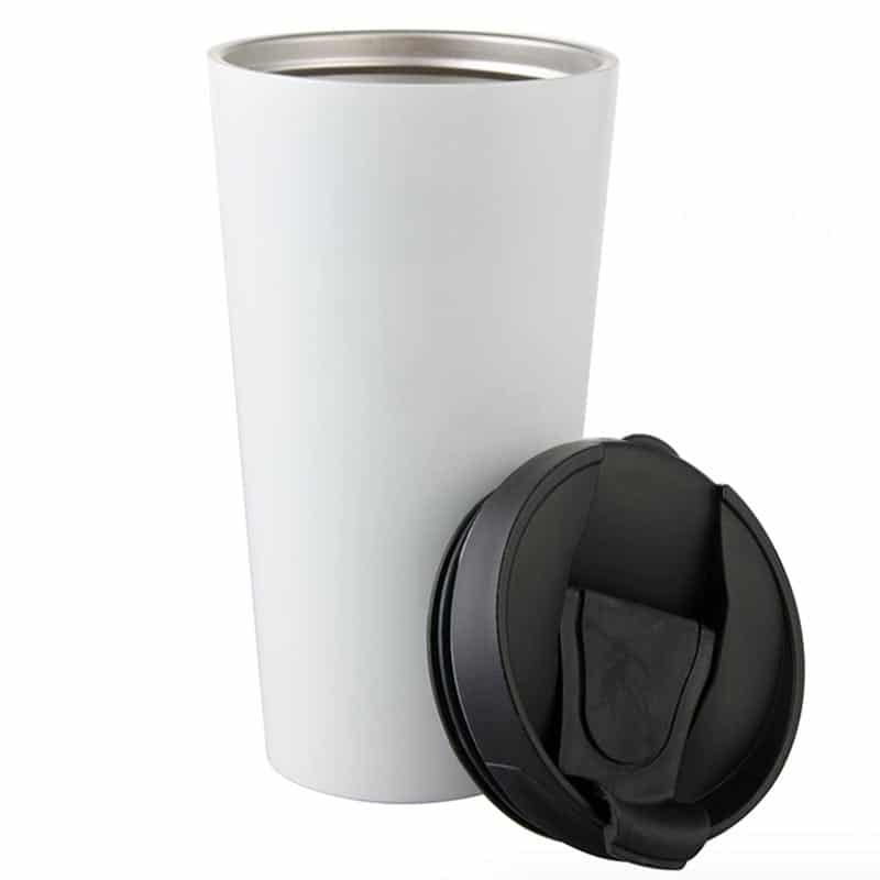 מתגו מאג טרמי לבן עם סגירה מיוחדת בצבע שחור לשמירה על חום/קור המשקה. מתנה מצויינת לעובדים שלכם לטיול חברה או לקפה של הבוקר במשרד.