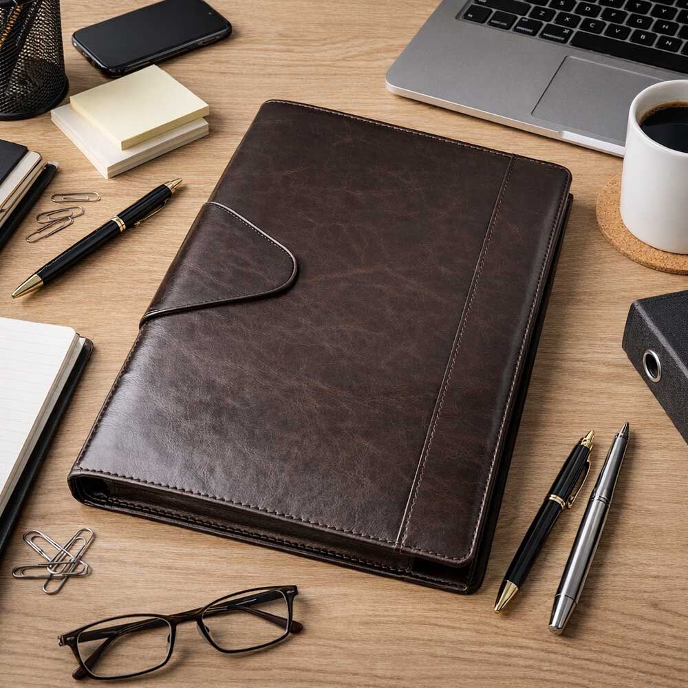מחברת A4 איכותית עם כריכת PU דמוי עור בגימור יוקרתי, בעיצוב קלאסי ומרשים המתאים במיוחד לסביבה עסקית, פגישות, כנסים וניהול יומיומי 📊