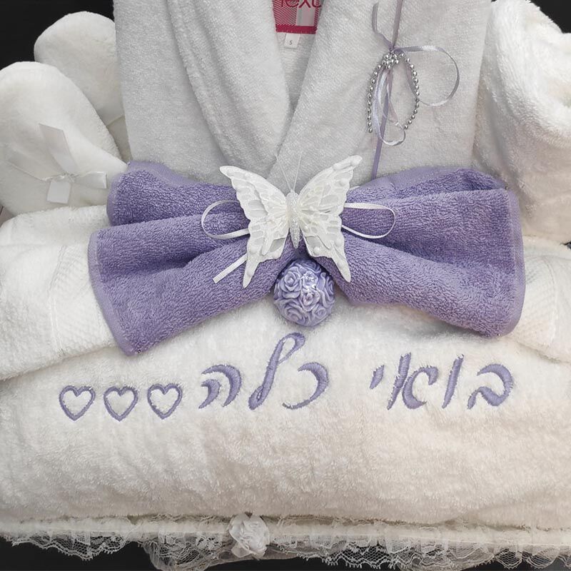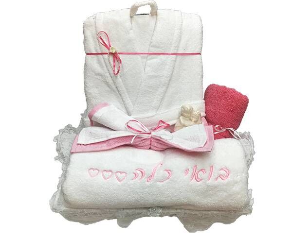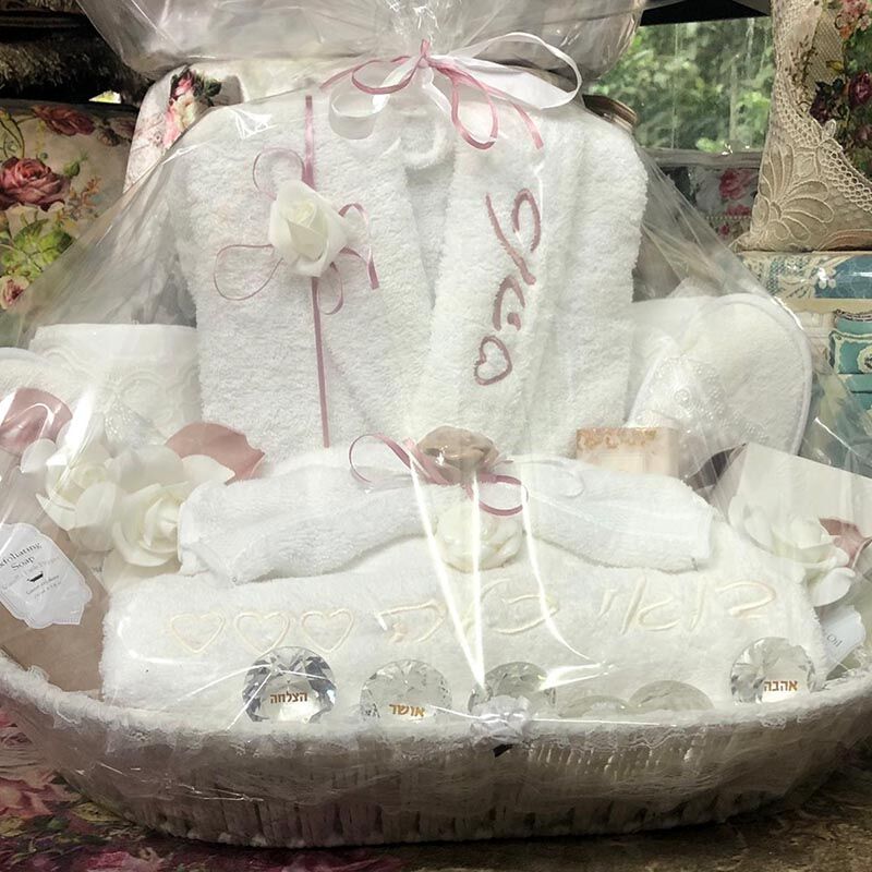 סט מתנה לכלה המכיל חלוק מפנק, מגבת גוף עם רקמה, 2 מגבות אישיות, סבונים ריחניים ארוז בסלסלה מהודרת ועטוף בצלופן וסרטי קישוט.