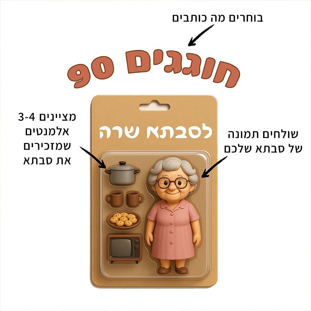 סט לאירוע משפחתי "Savta's Action Figure" – אתם רושמים מה סבתא אוהבת, ומעלים תמונה שלה אנחנו מייצרים אותה בתור דמות מגניבה בתוך קופסא ולצידה כל מיני אביזרים שקשורים אליה