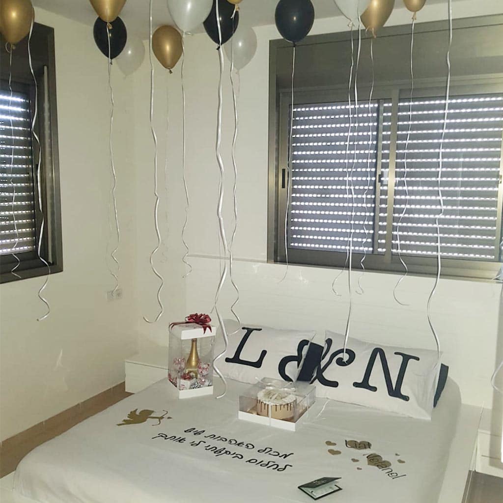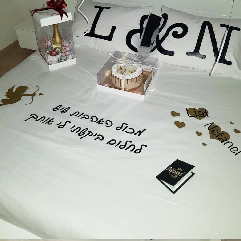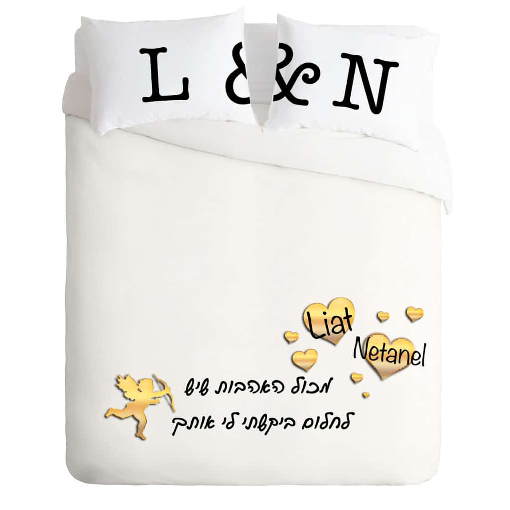 הסט כולל את האות הראשונה בשם שלכם על כל כרית, הקדשה גדולה לבחירתכם במרכז הציפה, לבבות מזהב עם השמות שלכם בשחור, וקופידון בזהב.