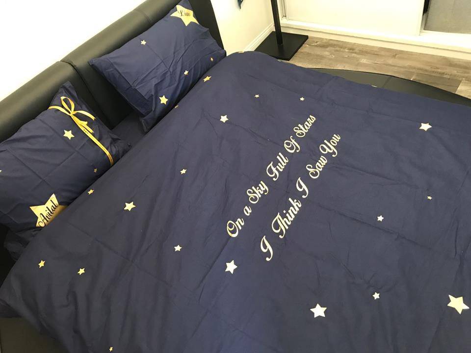 סט מצעים שחור/כחול נייבי "כוכבם".סט זוגי מלא שחור או כחול נייבי לבחירתכם עם פיזור של כוכבים משפט גדול על הציפה ושמות בתוך כוכבים מוזהבים על הכריות.