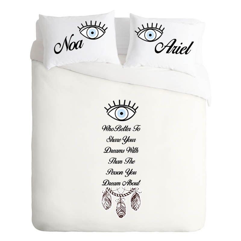סט מצעים "Dream Of You" הסט כולל 2 ציפיות ציפה זוגית וסדין, עם הדפסה של משפט שמות על הכריות עיניים ולוכד חלומות