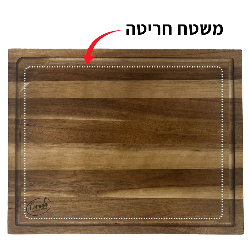 לוח גדול ומרשים בגודל 38×30 ס״מ, עשוי עץ אקציה מלא ואיכותי. כולל חריץ לניקוז נוזלים, שוליים משופעים להרמה קלה ומשטח עמיד ששומר על חדות הסכין לאורך זמן. מתאים גם לחיתוך וגם להגשה ישירות לשולחן.