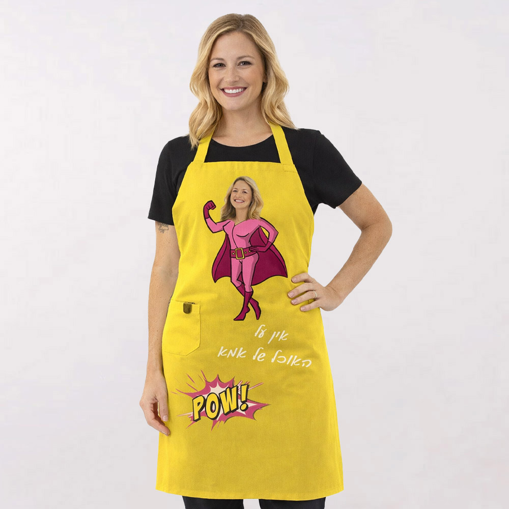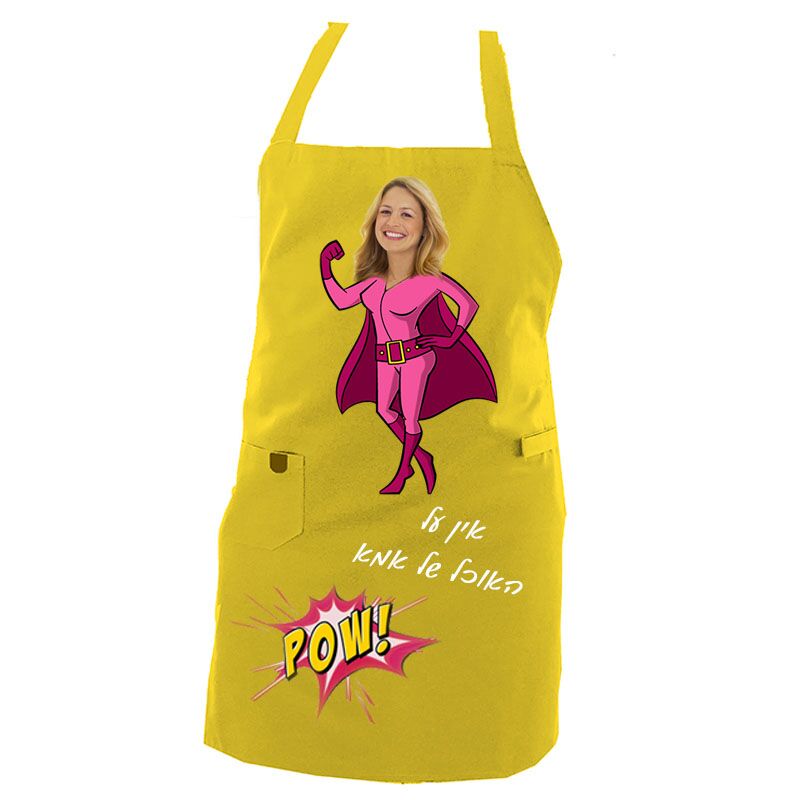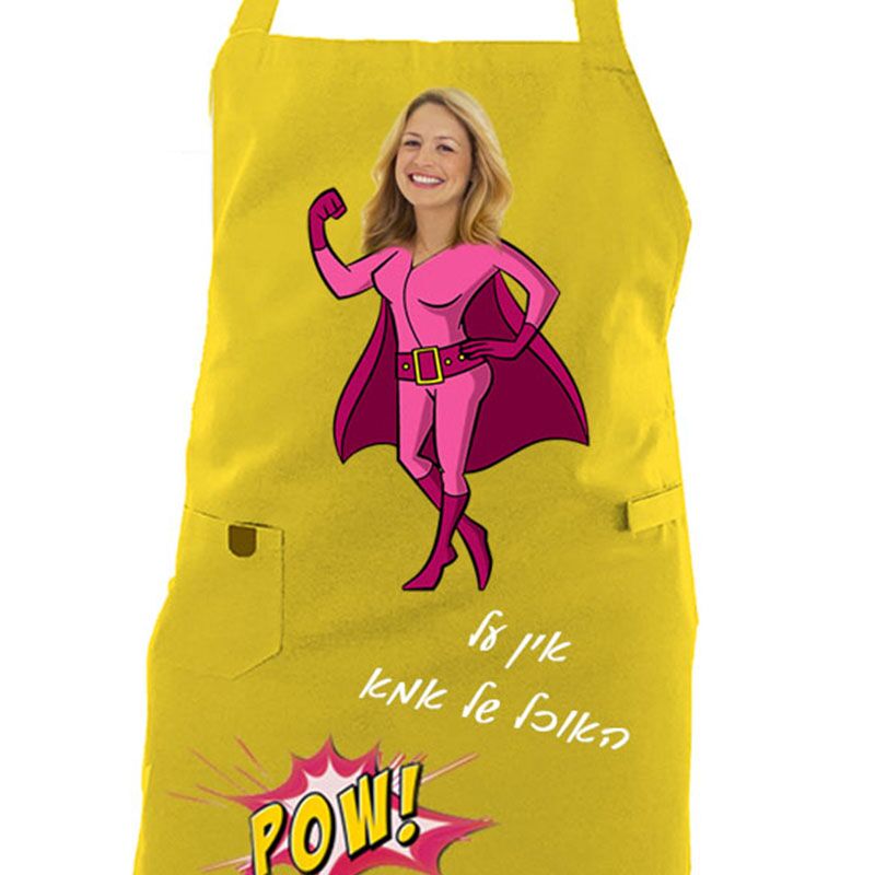 סינר "האוכל של אמא" ניתן לשנות את צבעי הסינר וההדפס לבחירתכם – התמונה של הפרצוף של אמא בגוף של סופר וומן!