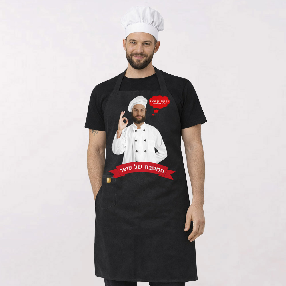סינר "המטבח שלי", ניתן לשנות את צבעי הסינר וההדפס לבחירתכם – שלחו לנו תמונת פנים ונחליף לתמונה שלכם עם גוף של שף!