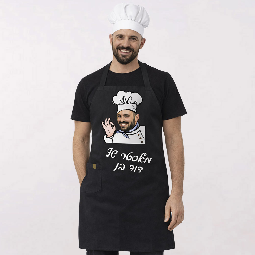 סינר "מאסטר שף", ניתן לשנות את צבעי הסינר וההדפס לבחירתכם – שלחו לנו תמונת פנים ונחליף לתמונה שלכם עם גוף של שף! –