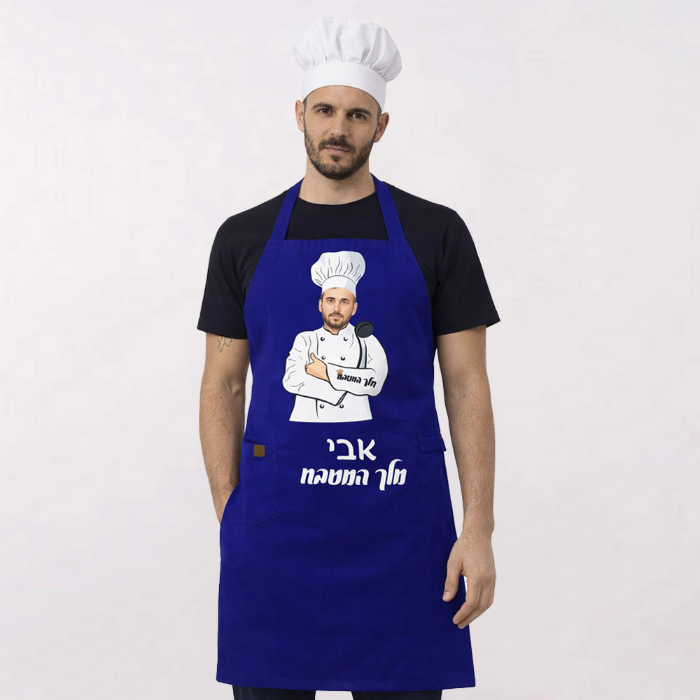 סינר "מלך המטבח", ניתן לשנות את צבעי הסינר וההדפס לבחירתכם – שלחו לנו תמונת פנים ונחליף לתמונה שלכם עם גוף של שף!