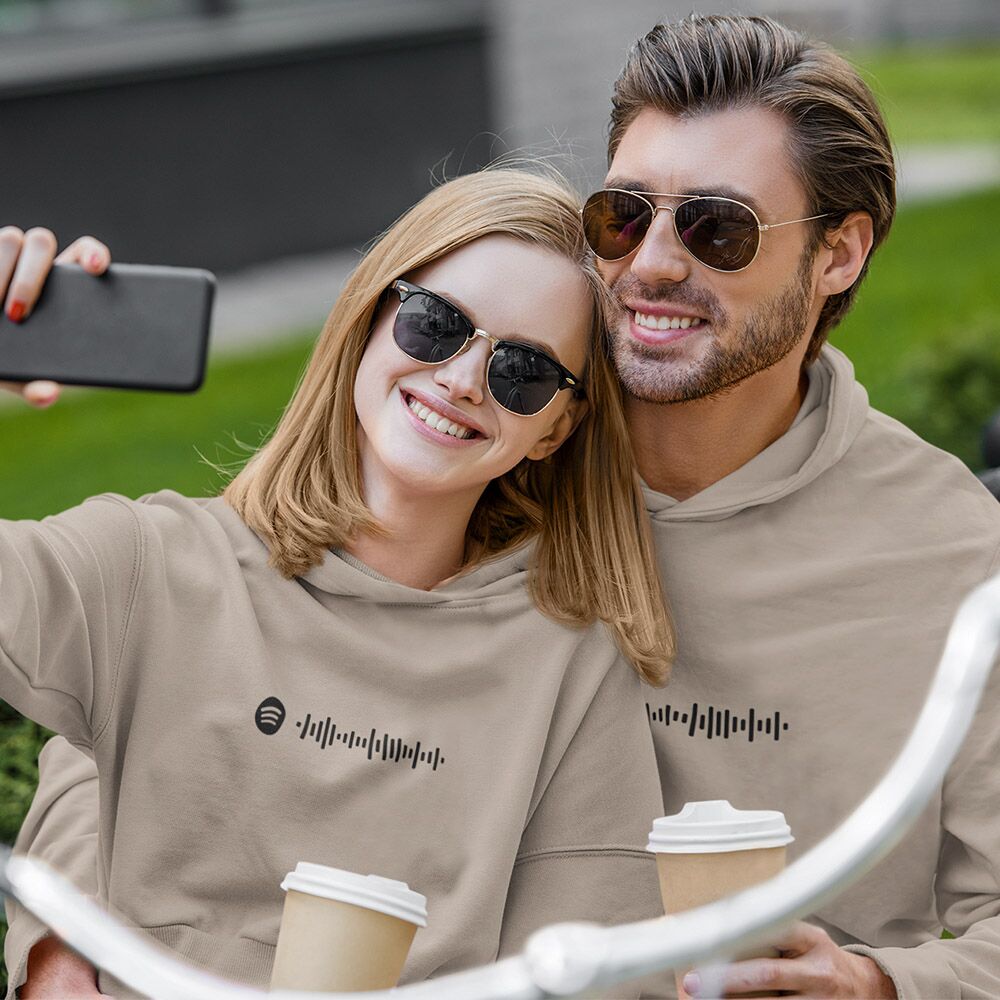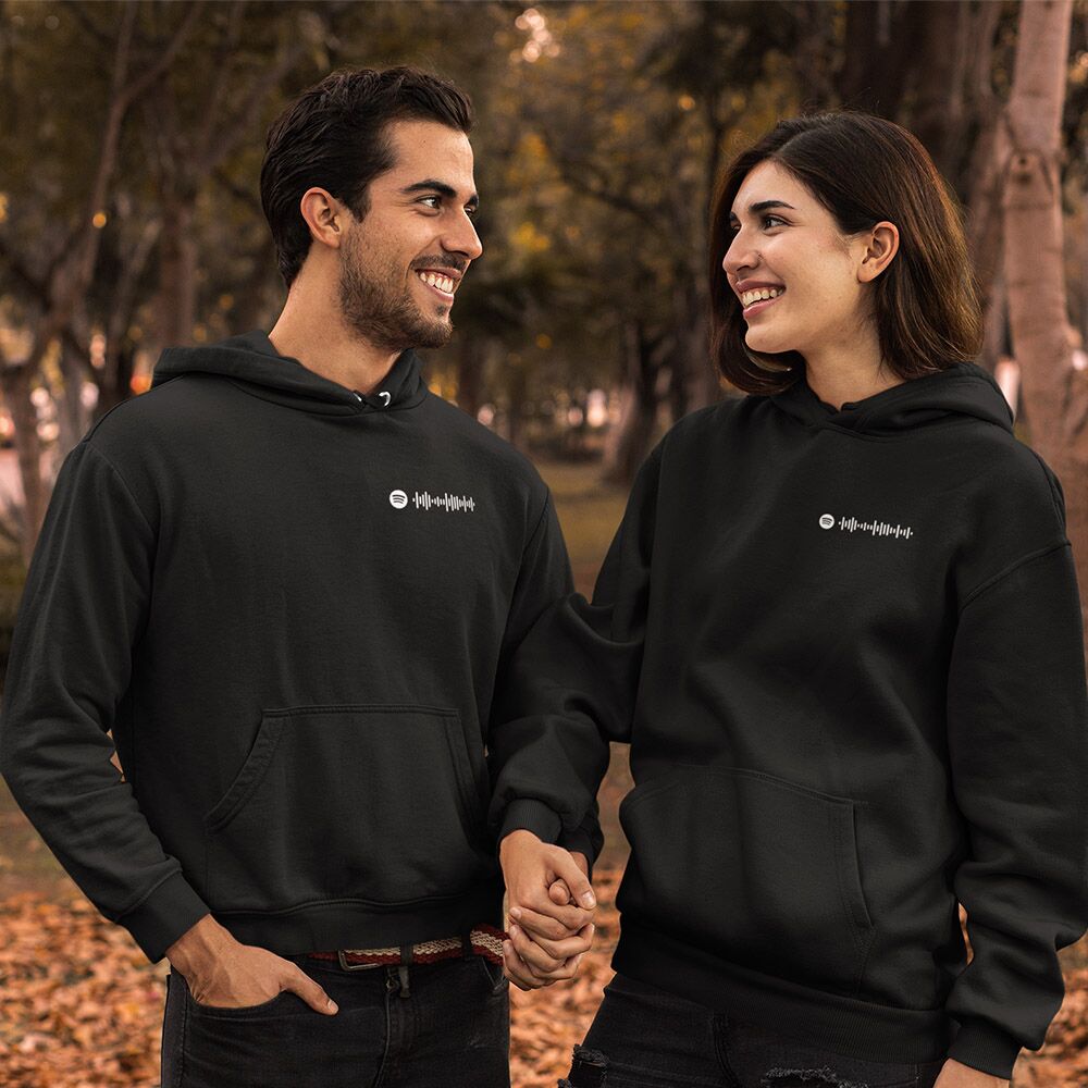 זוג קפוצונים מחממים עם הדפסה במרכז או כסמל כיס של קוד ספוטיפיי של השיר שלכם שאפשר לסרוק באפליקציה ספוטיפיי ולשמוע בנייד